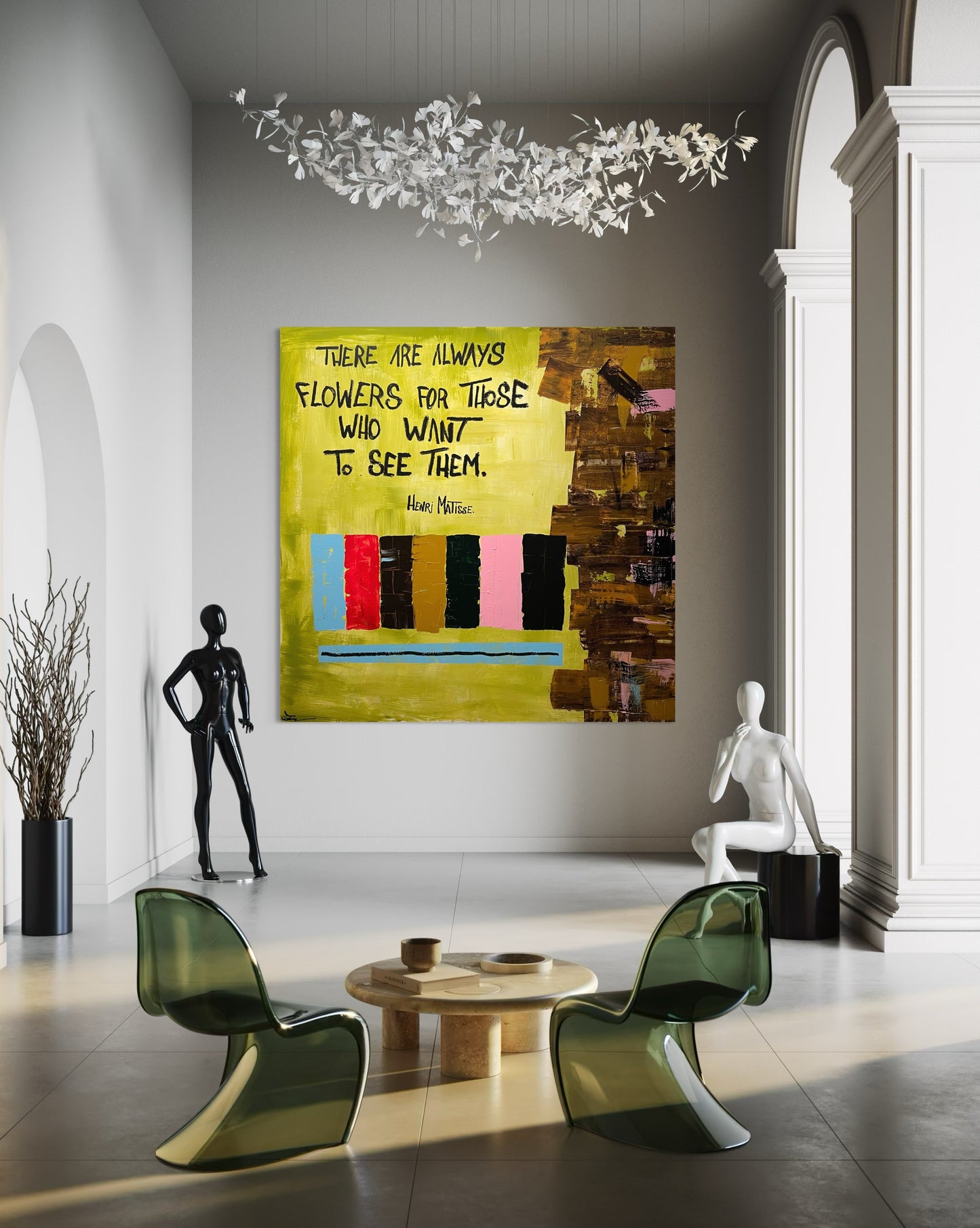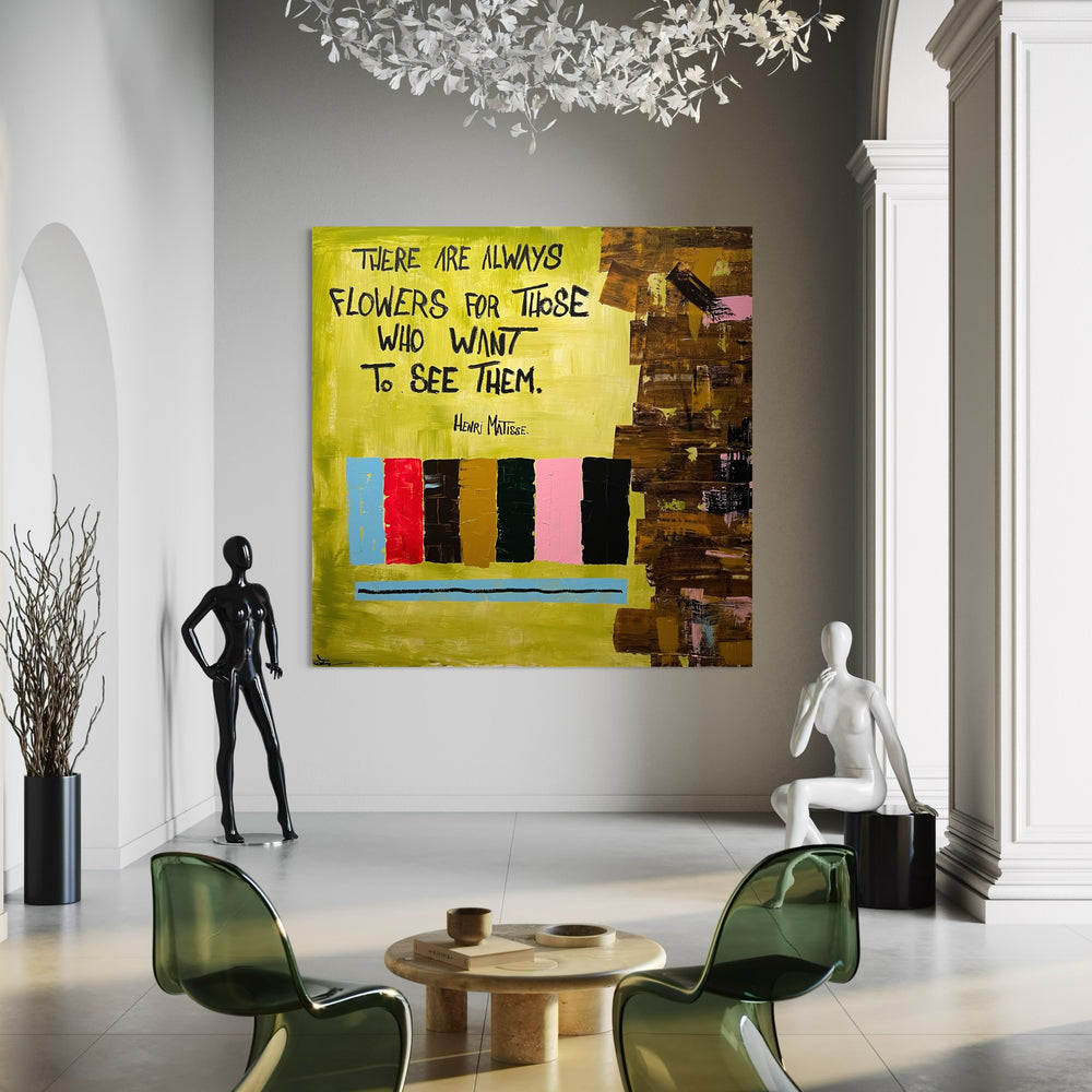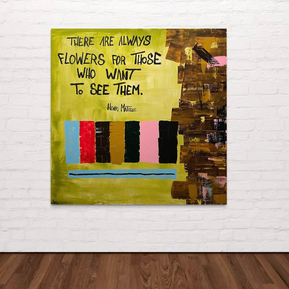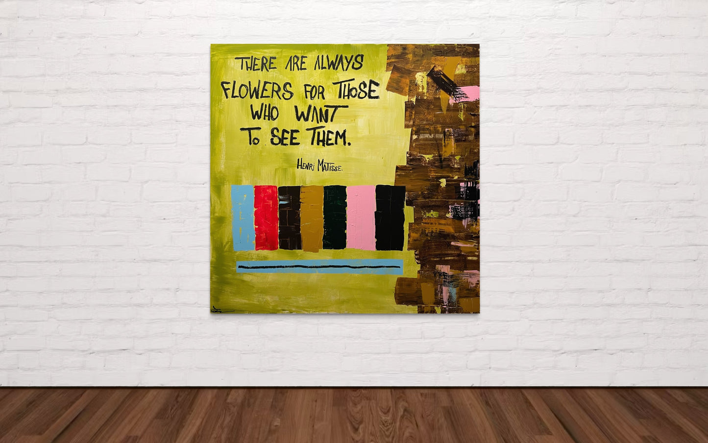 This large-scale canvas is painted featuring a soft, light khaki background that evokes calm and subtle warmth. Across the canvas, rectangular bands of color are arranged side by side, suggesting either a palette of possibilities or a field of flowers, in harmony with Henri Matisse’s quote: