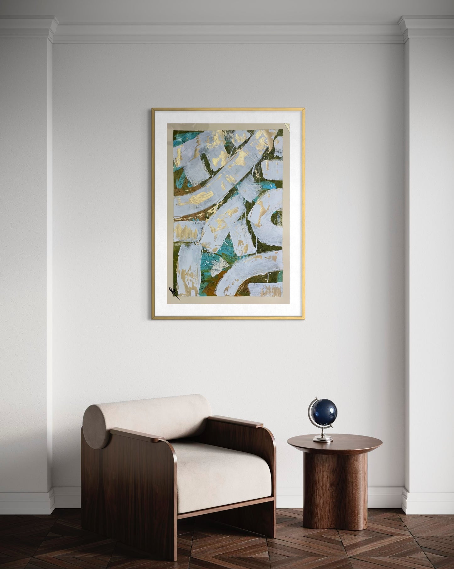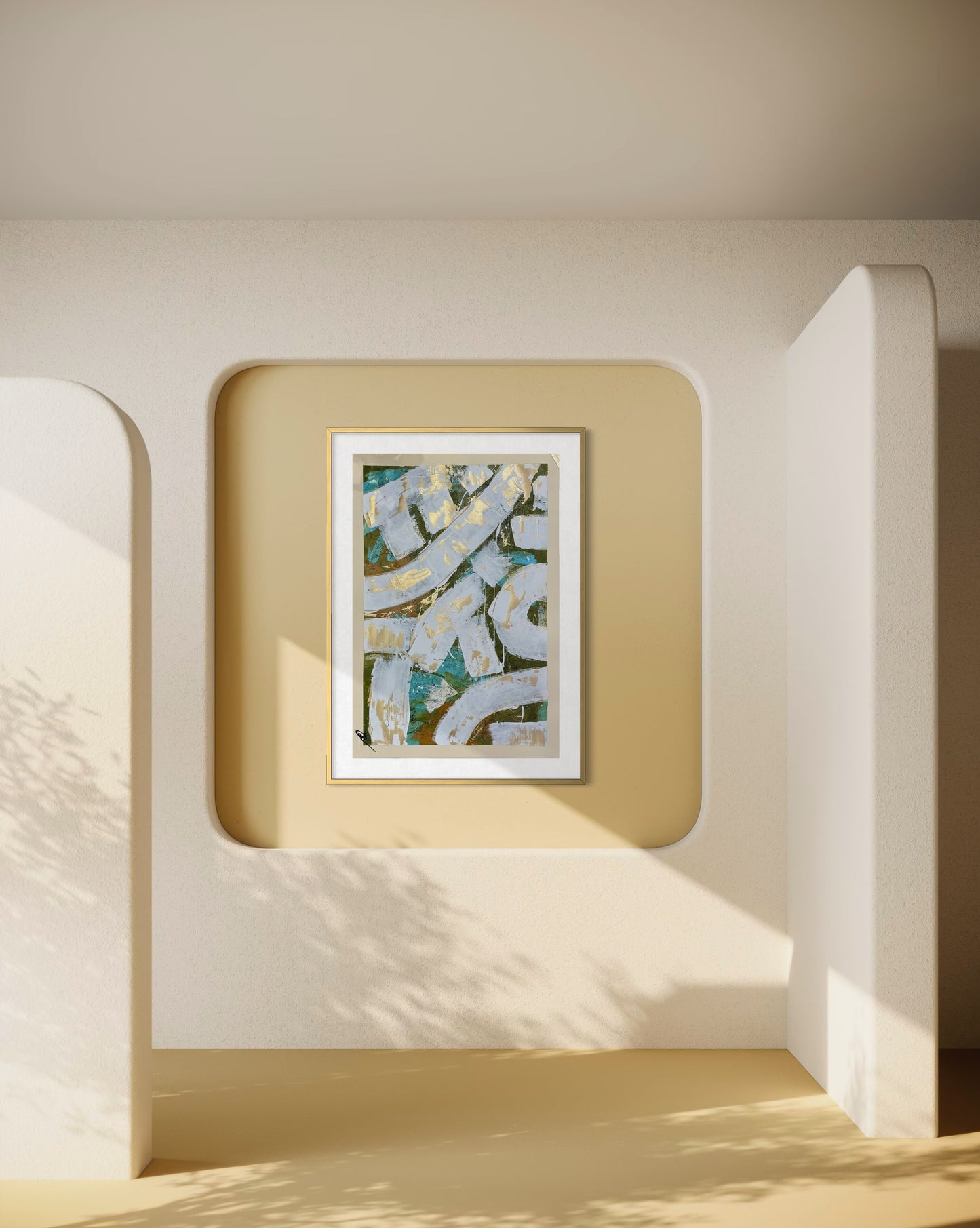 "Soft Wilderness" explores the quiet poetry of nature through abstract form and movement. Expansive white gestures sweep across layered greens, turquoise, and earthy browns, evoking natural pathways, shifting landscapes, and the gentle rhythm of organic growth.
