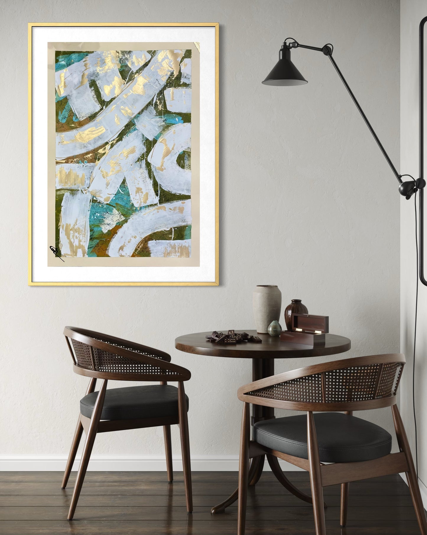 Subtle gold accents emerge like filtered sunlight touching leaves and soil, bringing warmth and refinement to the composition. The textured surface and expressive marks create depth and complexity, revealing a balance between spontaneity and intention.