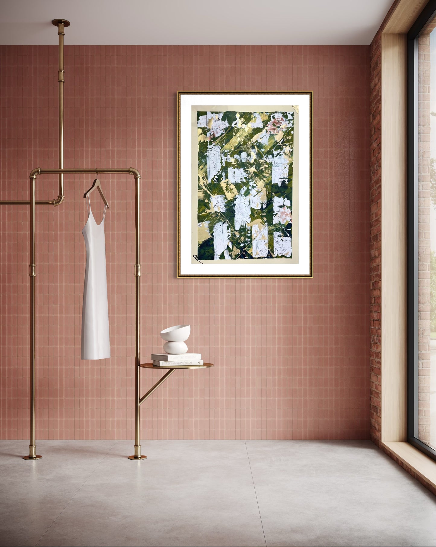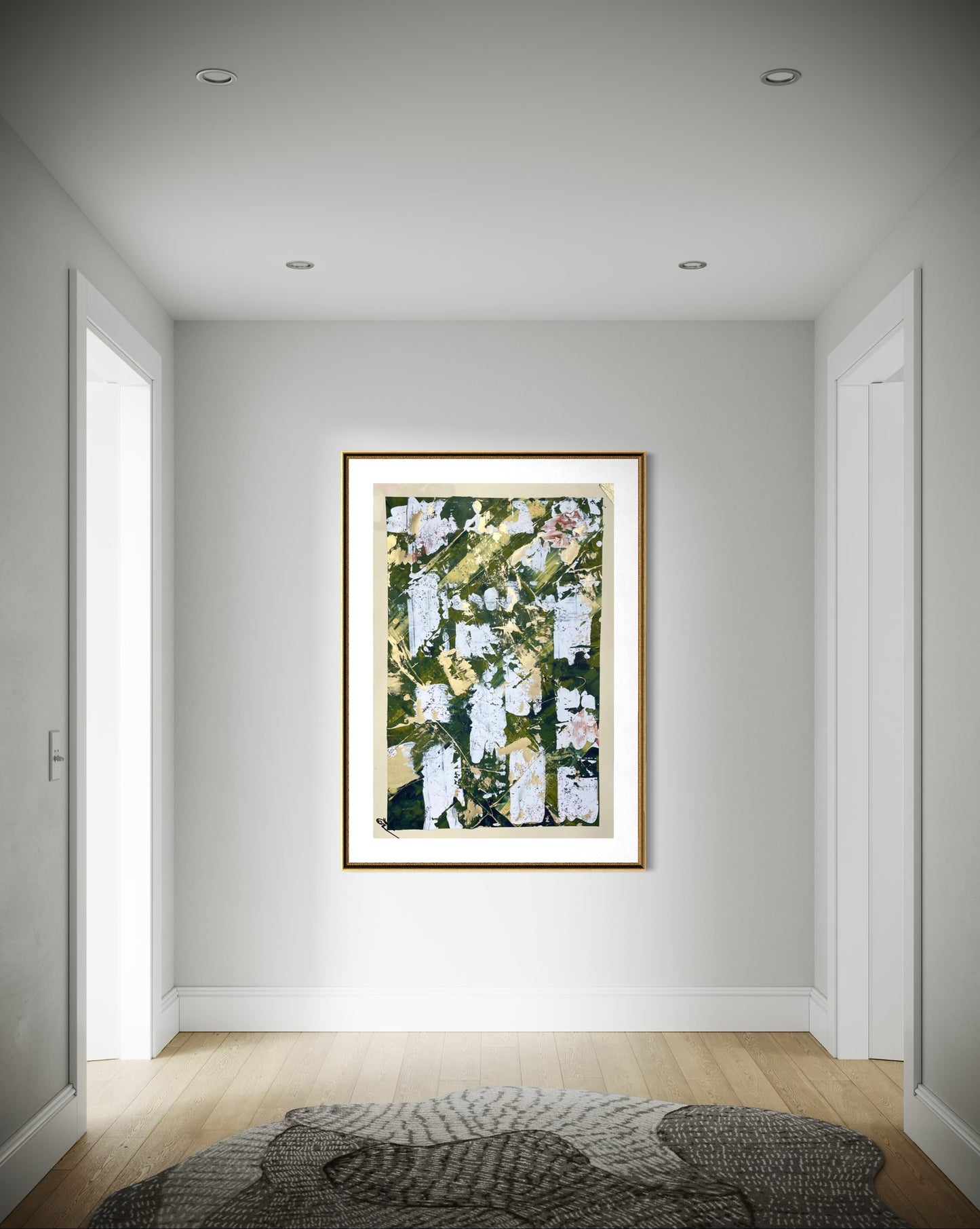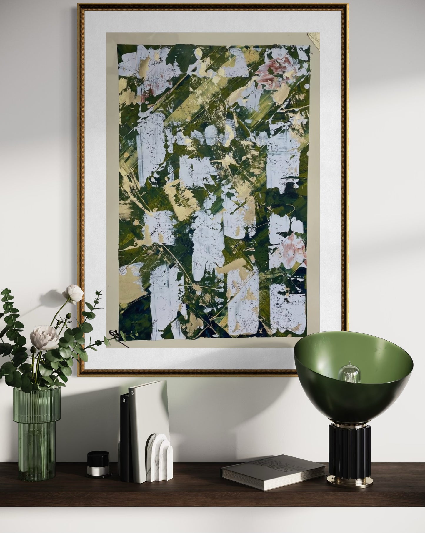 The dynamic brushstrokes and spontaneous markings create a strong sense of rhythm and depth, evoking growth, motion, and the natural pulse of living landscapes. Subtle touches of soft blush tones add nuance and visual complexity, enriching the composition without overwhelming its balance.
