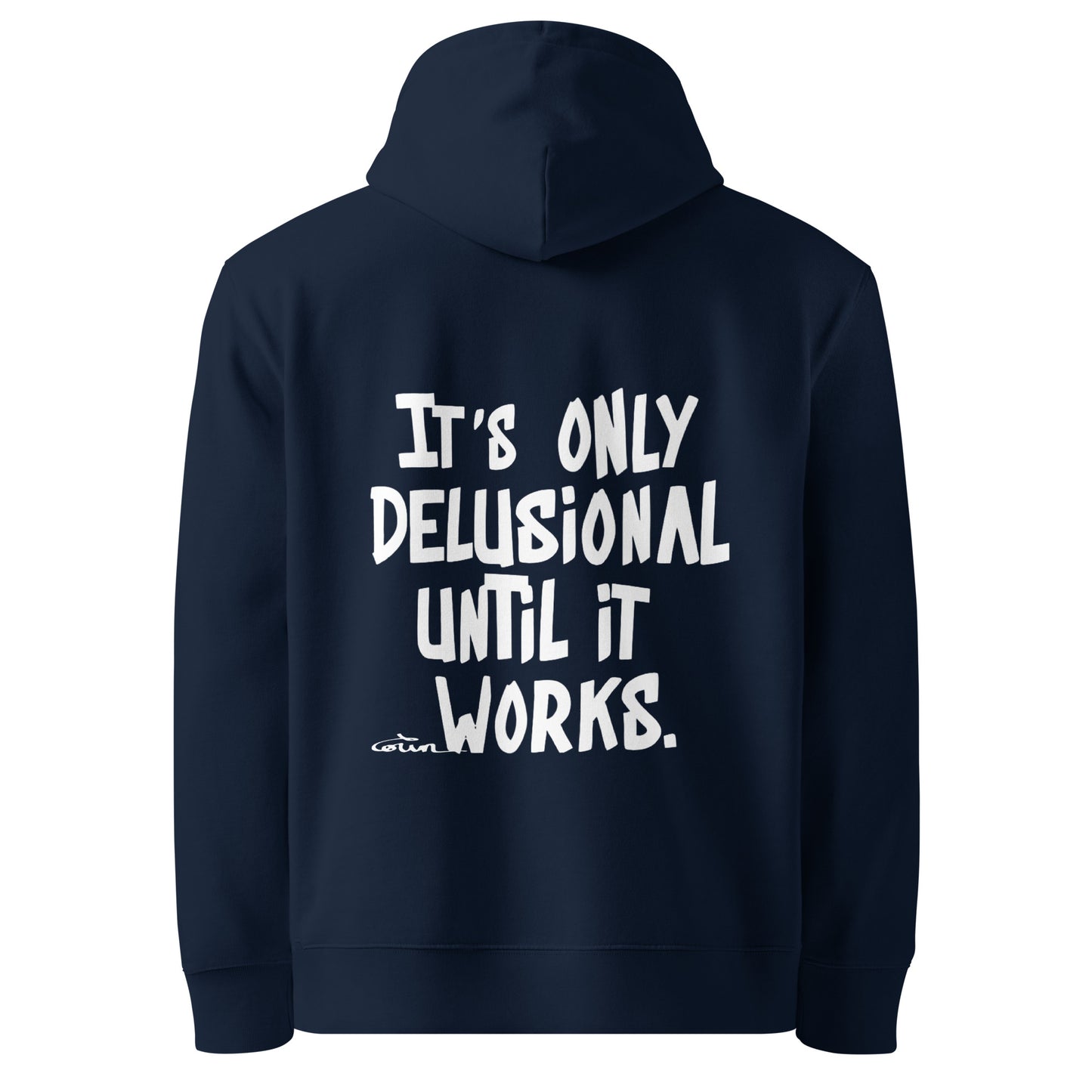 Unisex essential eco hoodie - IT'S ONLY DELUSIONAL UNTIL IT WORKS - White ink