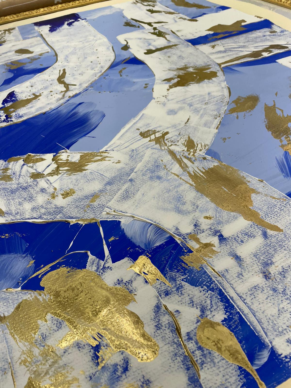 Subtle gold accents appear like reflections of light on a shifting surface, adding warmth and refinement to the composition. The balance between fluid gestures and structured curves creates a harmonious tension, where energy and serenity coexist.